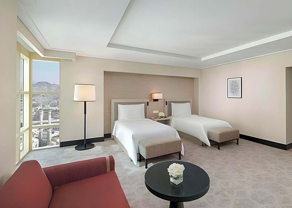 Many room options cater to different group sizes and tastes, from Deluxe Club rooms with Partial Kaaba View (and Lounge Access in select layouts) to Premier Club configurations featuring Twin or King beds and Haram or Kaaba views. Highlights include the 538-square-foot Premier Club, Twin; the 484-square-foot Deluxe Club with 2 Twin beds and Partial Kaaba View; and the Panoramic Suite offering Haram View for a sweeping stay.